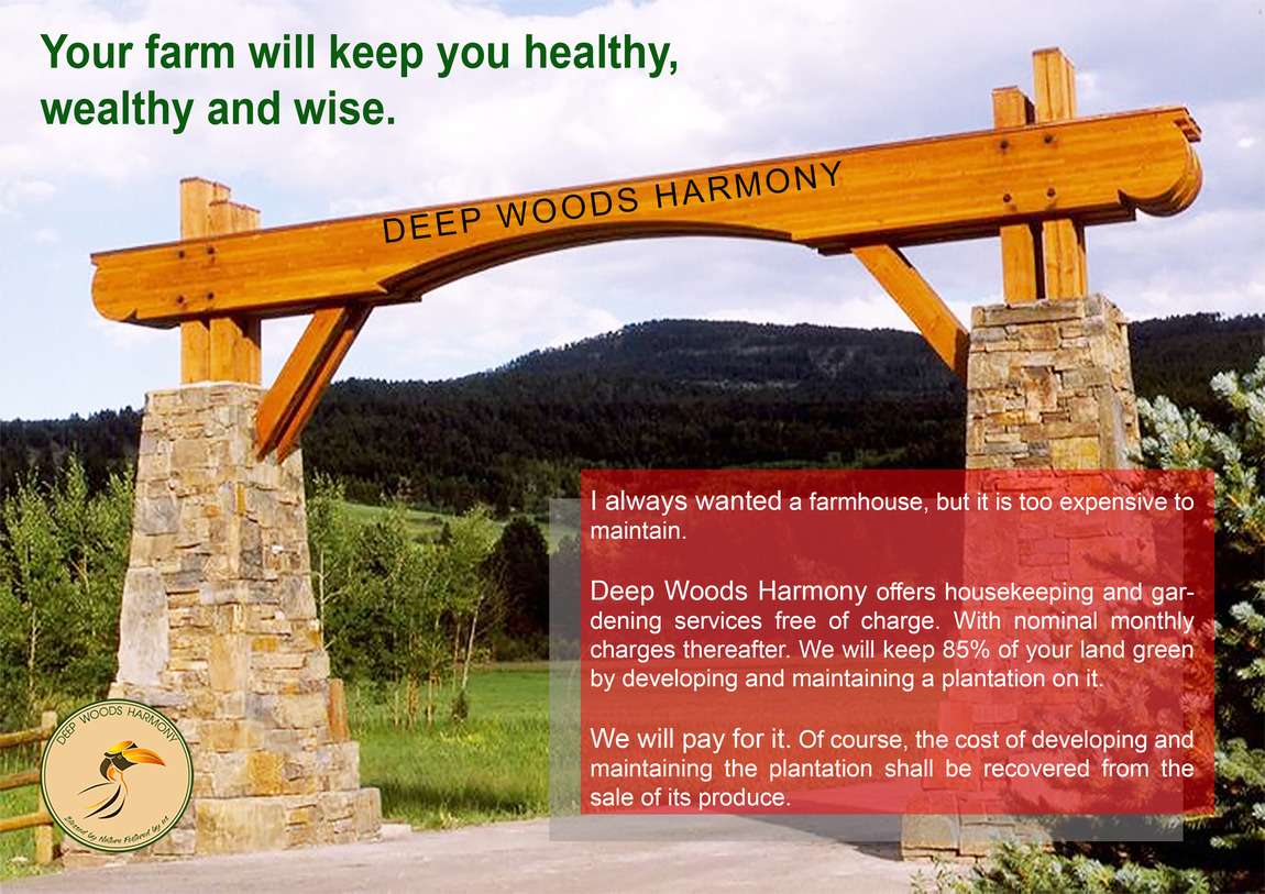 Deep Woods Harmony offers housekeeping and gardening services free of charge.With nominal monthly charges thereafter. we will keep 85% of your land green by developing and maintaining a plantation on it.